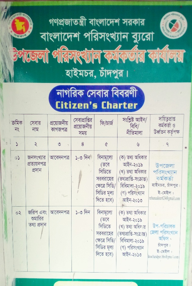 | সিটিজেন চার্টার বাংলাদেশ পরিসংখ্যান ব্যুরো পরিসংখ্যান ও তথ্য ব্যবস্থাপনা বিভাগ পরিকল্পনা মন্ত্রণালয় গণপ্রজাতন্ত্রী বাংলাদেশ সরকার ক ও খ ) নাগরিক ও প্রাতিষ্ঠানিক সেবা | ||||||||